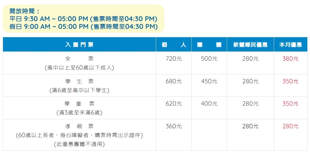 ※連續假期及寒假比照假日營運時間辦理,營業時間如有微幅調整以現場公告為主。如遇天氣等不可抗力之因素,本園區將另行公告開/關園時間。