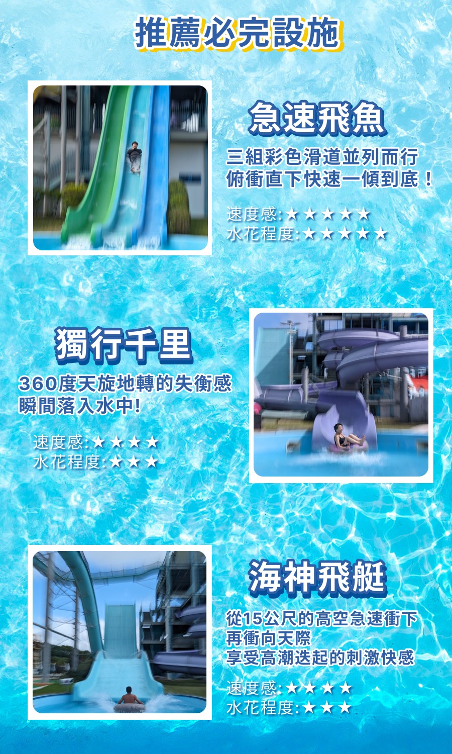 滑水道90度加速連續彎道的雙重驚險,雙人共乘同心體驗,通過極速過彎的瞬間,立即墜入漂浮何流之中。