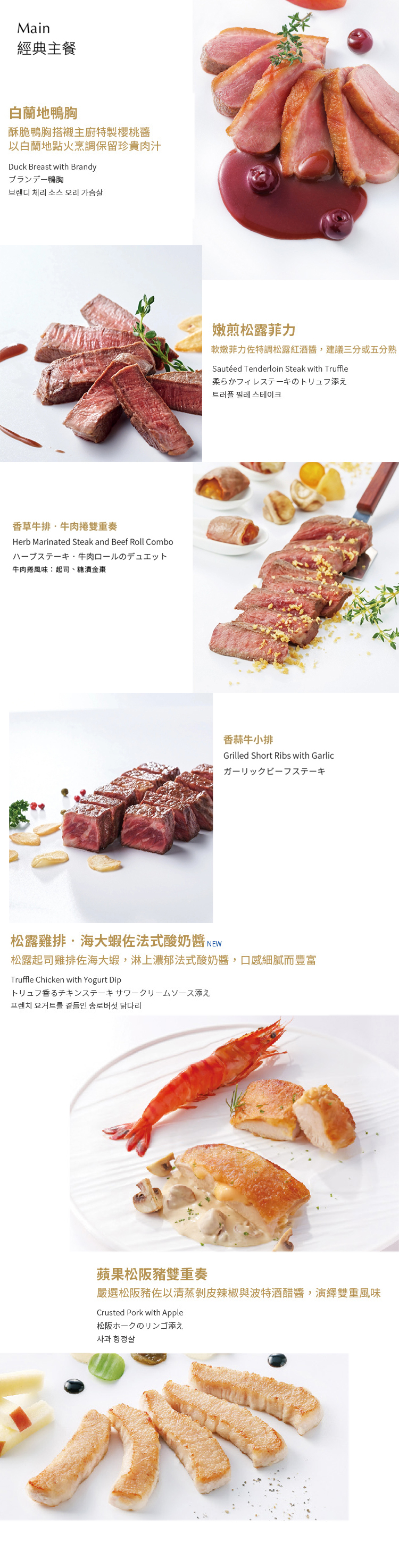 夏慕尼大膽顛覆傳統鐵板燒的老式印象,創新結合法式料理的細膩手法與 Lounge Bar 的浪漫設計風格,將時尚浪漫融入美食中,營造出時尚精品店般的用餐氛圍。整套餐從開胃菜、主餐、甜點、飲料共10道菜色,傳達消費者「第一時間。先嚐。嚐鮮」的品牌精神,讓品嚐美食變成一種味覺享受與視覺饗宴。