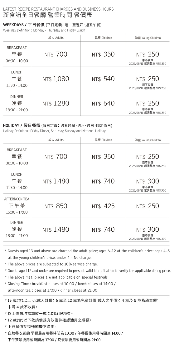 • 餐廳訂位專線:04-2224-0888 轉 新食譜全日餐廳