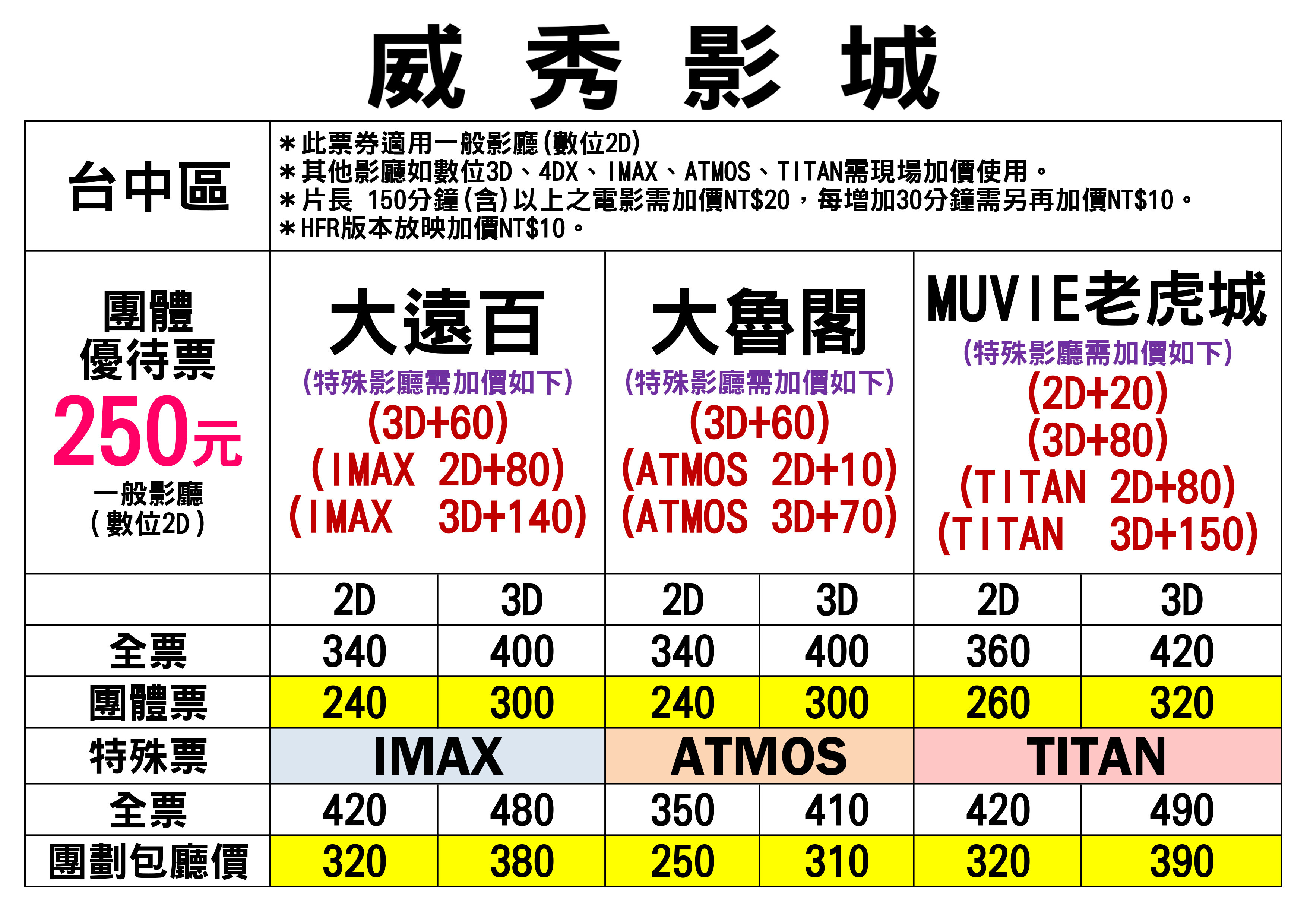 (以下依台中大遠百/台中大魯閣新時代威秀影城為例,各地區票價稍有不同,可至官網查詢各地區票價)