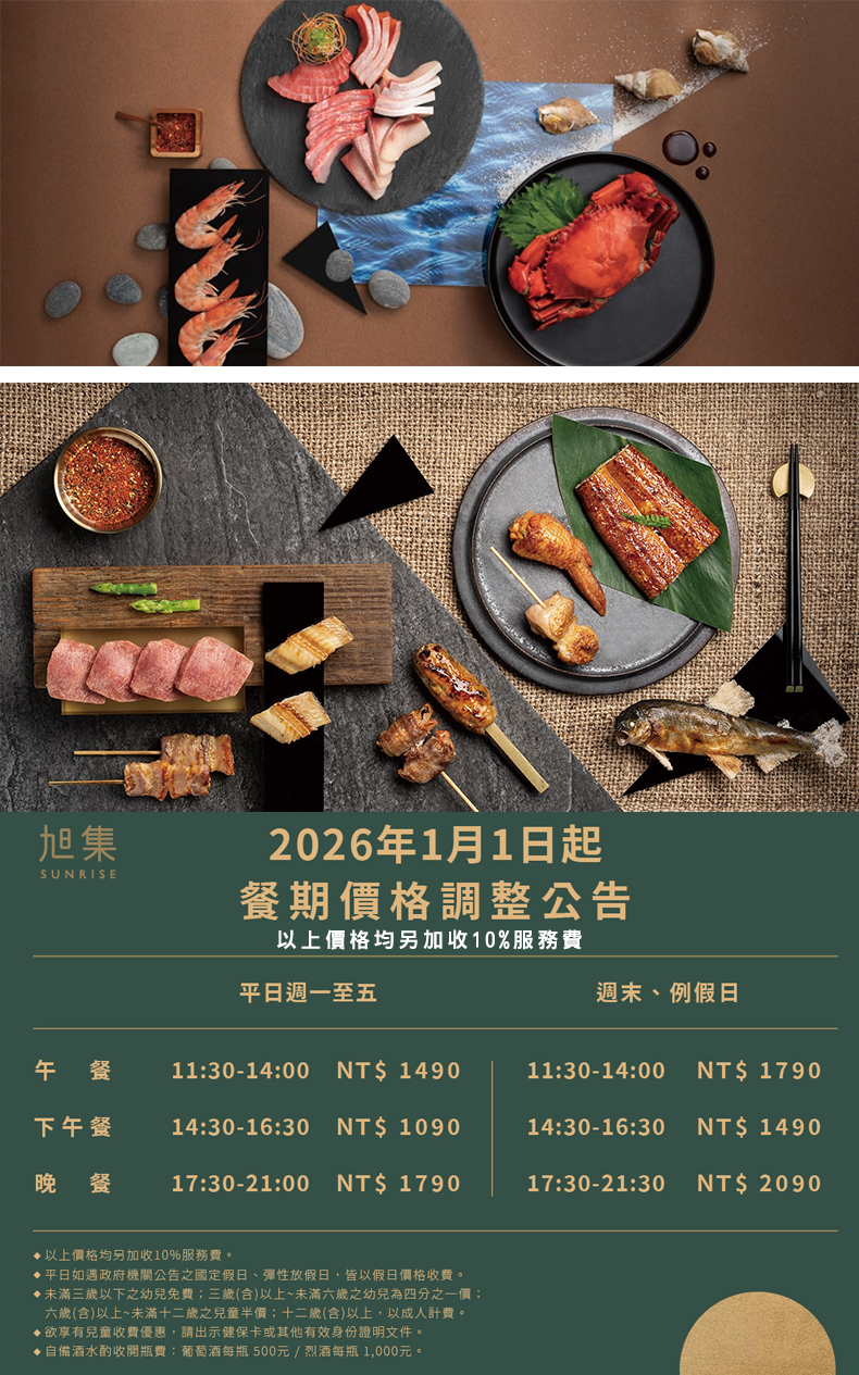 旭集/饗饗 平日晚餐/假日午餐通用券1969元(已含10%服務費)
