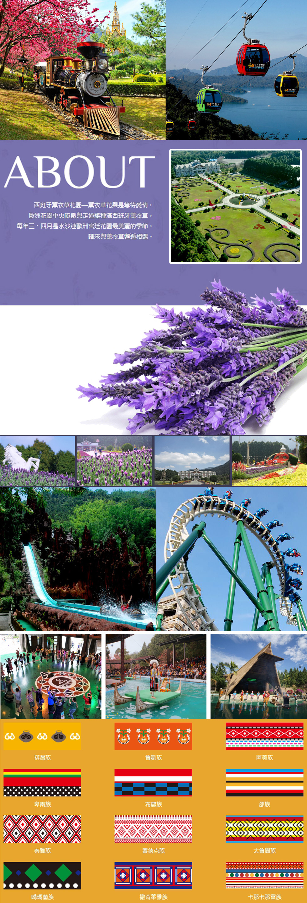 除此之外浪漫唯美的歐洲花園有著媲美國外的精緻風貌,豐富的原住民文化也是九族文化村的重點特色,從原住民族群傳統的服飾、建築、圖像、美食、音樂等,充分展現台灣原有的文化及特色!