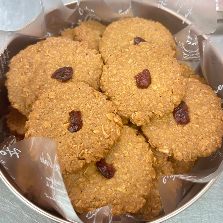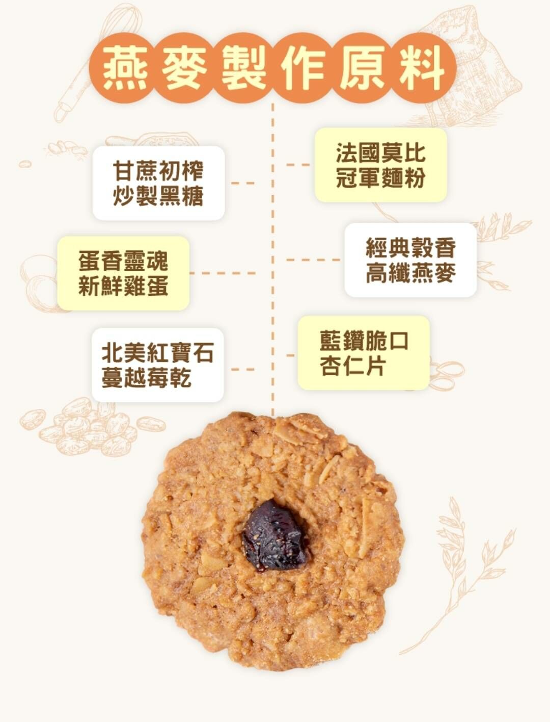 食品成分:奶油、黑糖、糖粉、新鮮雞蛋、燕麥片、蔓越莓乾、低筋麵粉、蘇打粉、杏仁片