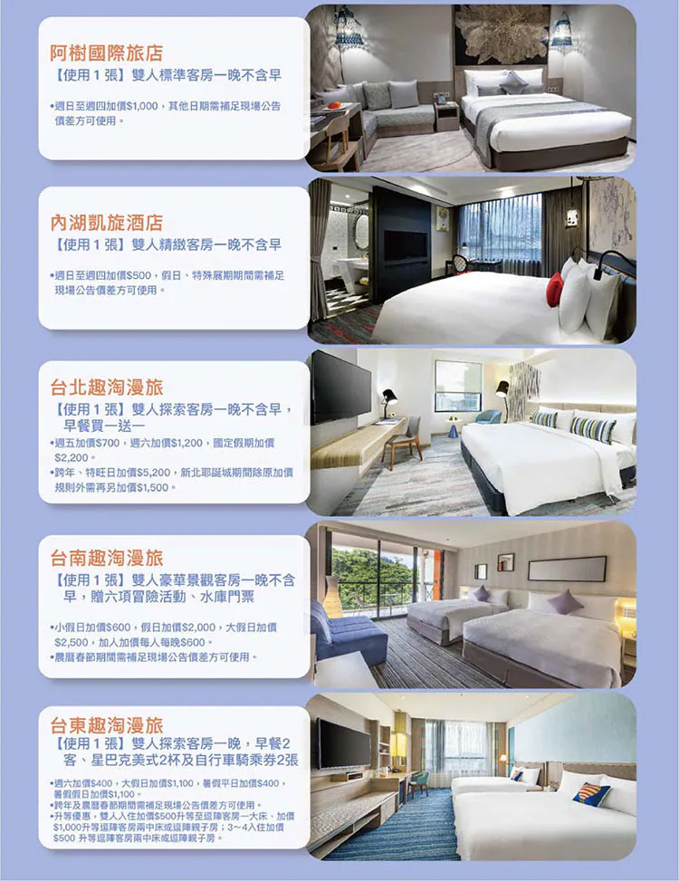 3.加碼優惠、加人加價、特殊節日加價、平假日定義皆依各飯店公告為準。
